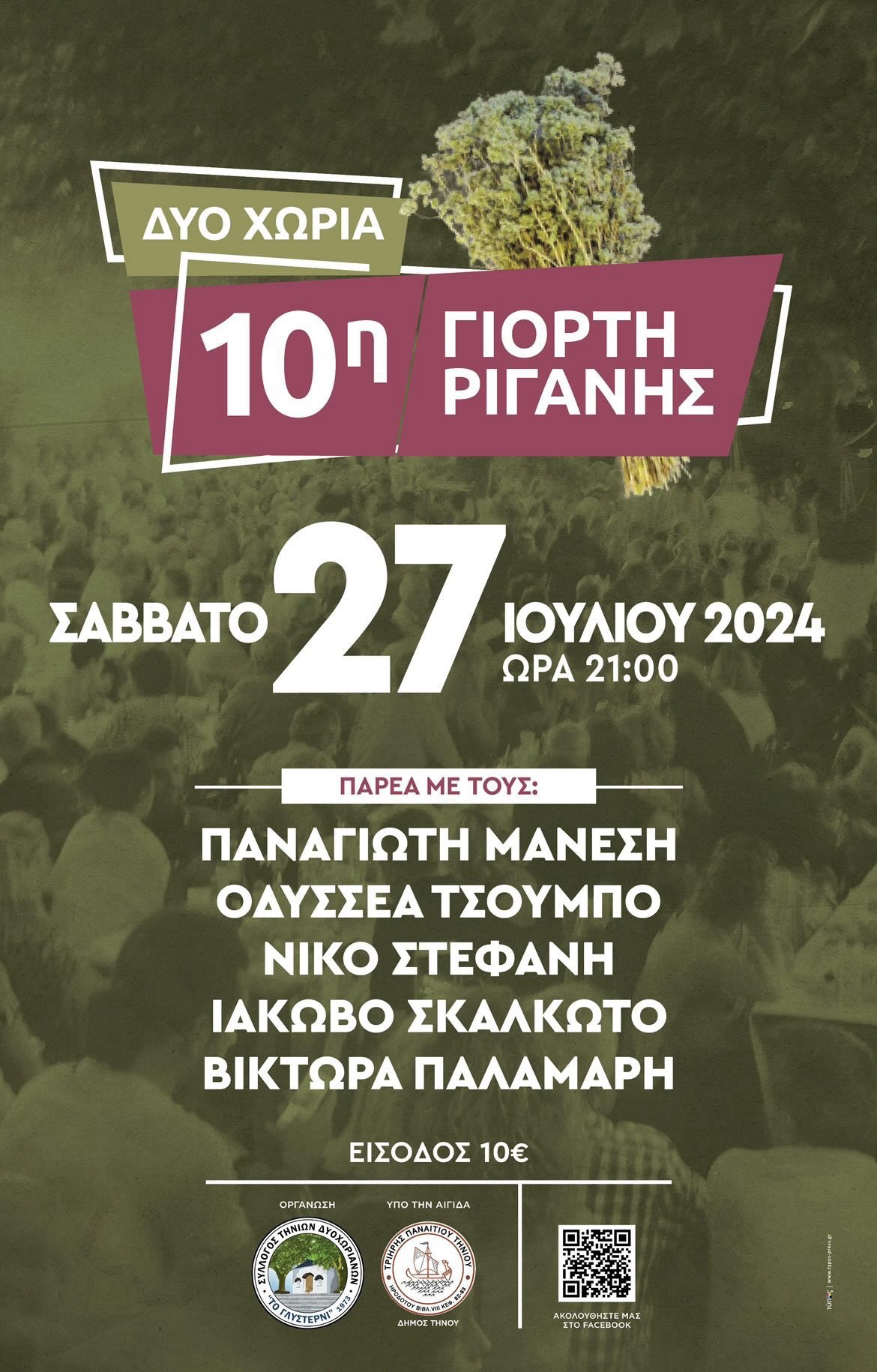 Το Σάββατο 27 Ιουλίου 2024 μετά 21:00 η 10η Γιορτή Ρίγανης, παρέα με τους Παναγιώτη Μάνεση, Οδυσσέα Τσουμπο, Νίκο Στεφανή, Ιάκωβο Σκαλκώτο και Βίκτωρα Παλαμάρη.