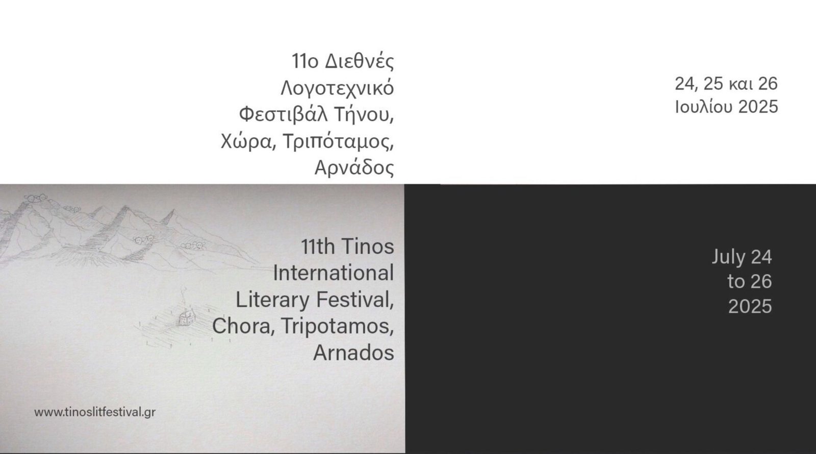Το 11ο Διεθνές Λογοτεχνικό Φεστιβάλ Τήνου με 15 συγγραφείς από 6 χώρες θα διεξαχθεί στη Χώρα, τον Τριπόταμο και τον Αρνάδο της Τήνου στις 24, 25 και 26 Ιουλίου. Σε εποχές δύσκολες ο πολιτισμός είναι ζωτικός παράγοντας για την κοινωνική συνοχή. H λογοτεχνία φωτίζει τις ζωές μας και μαςκάνει να νιώθουμε ότι είμαστε ακόμα εδώ, ζωντανοί. Τα δέκα μέχρι σήμερα διεθνή λογοτεχνικά φεστιβάλ έθεσαν τις βάσεις για να καταστεί η Τήνος, εκτός από θρησκευτικός, τόπος και προορισμός καλλιτεχνικός. Ο φάρος αυτός της λογοτεχνίας που άναψε στην Τήνο το 2010 δεν σβήνει και με υψηλό αίσθημα ευθύνης συνεχίζουμε. Χάρη στην υποστήριξή του κοινού το φεστιβάλ ολοένα μεγαλώνει και διευρύνεται. Φέτος, εκτός από τις καθιερωμένες λογοτεχνικές βραδιές, θα έχομε βίντεο, μουσική, χορό, ξεναγήσεις, περιηγήσεις, καθώς και απρόσμενες συναντήσεις ποιητών με το κοινό στα στενά της Χώρας το Σάββατο το μεσημέρι.