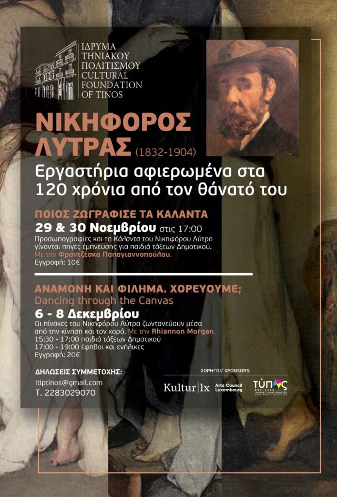 Με αφορμή τη συμπλήρωση 120 ετών από τον θάνατο του σπουδαίου Τήνιου Ζωγράφου Νικηφόρου Λύτρα, το Ίδρυμα Τηνιακού Πολιτισμού διοργανώνει μια σειρά εργαστηρίων για παιδιά και ενήλικες. Σκοπός να τιμήσει τον “πατέρα” της νεοελληνικής ζωγραφικής, τον γιο ενός λαϊκού μαρμαρογλύπτη γεννημένου στον Πύργο της Τήνου, αναδεικνύοντας τον πλούτο της πολιτιστικής κληρονομιάς του νησιού.