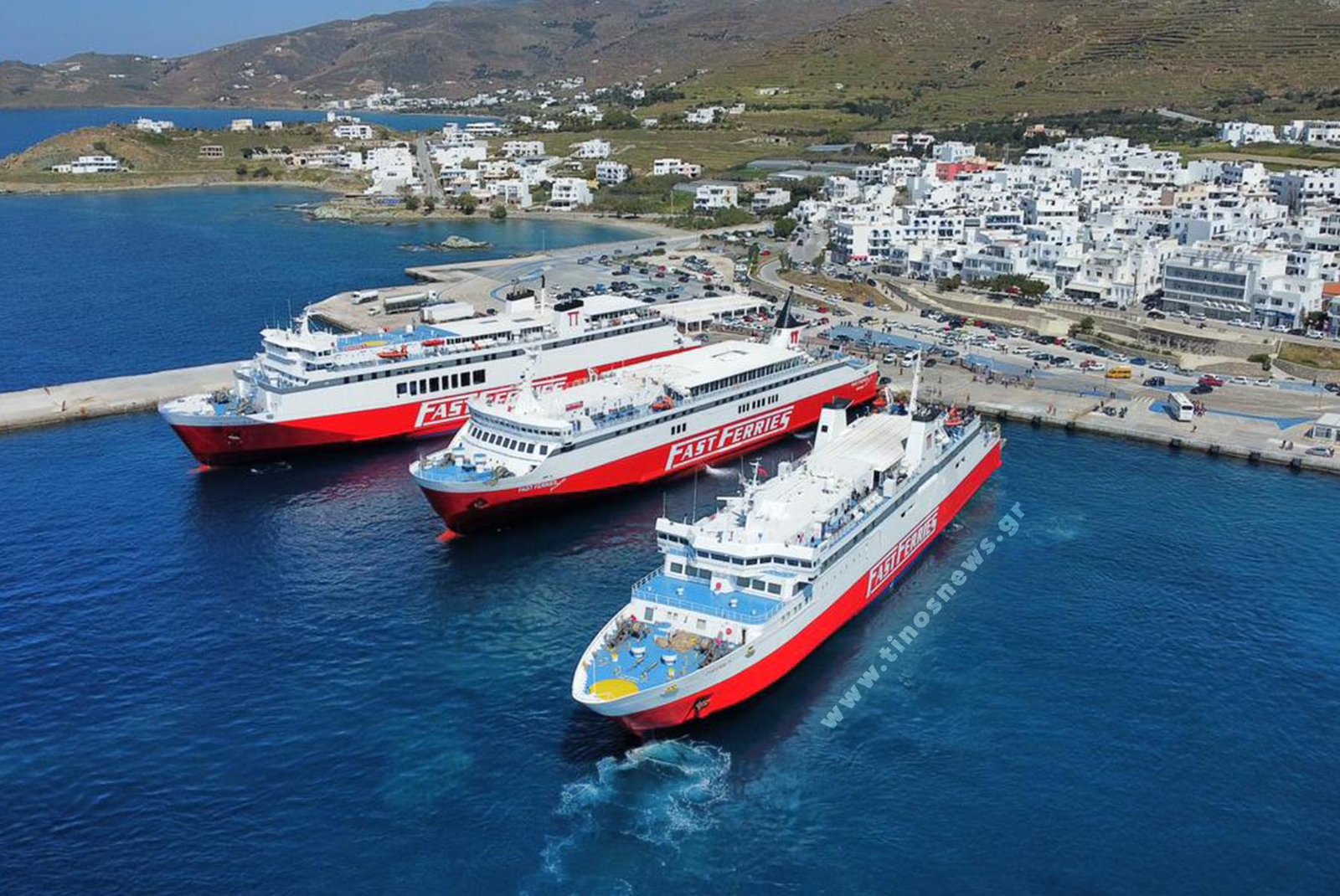 Μια υπέροχη εικόνα είδαμε σήμερα Μεγάλη Πέμπτη στο λιμάνι της Τήνου με τα 3 επιβατικά πλοία της Fast Ferries να δένουν στο λιμάνι πιο συγκεκριμένα το Theologos P., Fast Ferries Andros & Ekaterini P.