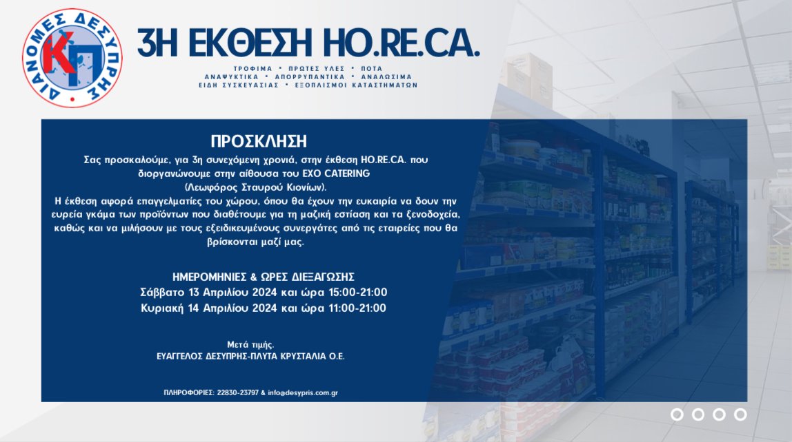Σας προσκαλούμε, για 3η συνεχόμενη χρονιά, στην έκθεση HO.RE.CA. που διοργανώνουμε στην αίθουσα του EXO CATERING (Λεωφόρος Σταυρού Κιονίων).