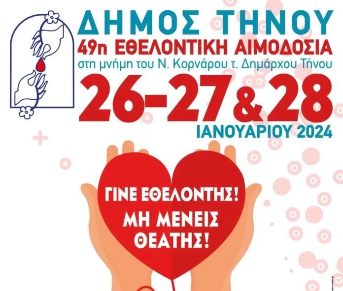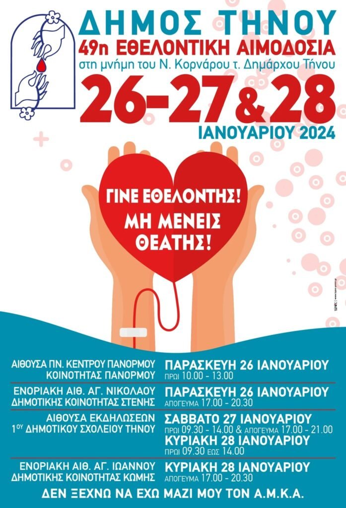 49η Εθελοντική Αιμοδοσία Δήμου Τήνου στη μνήμη του Ν. Κορνάρου τ. Δημάρχου Τήνου. 26 – 27 & 28 Ιανουαρίου 2024