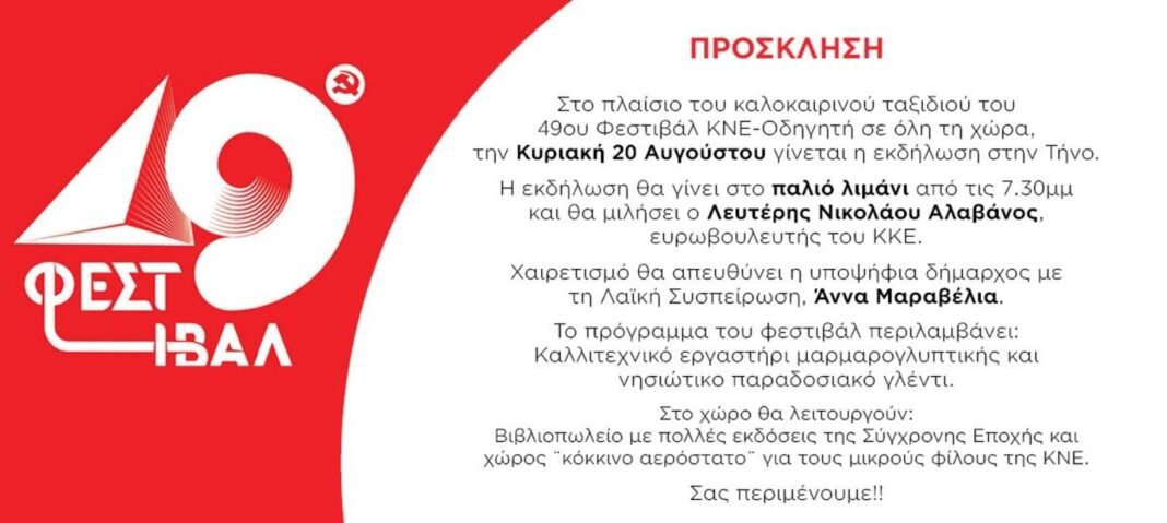Στο πλαίσιο του καλοκαιρινού ταξιδιού του 49ου Φεστιβάλ ΚΝΕ – Οδηγητή σε όλη τη χώρα, την Κυριακή 20 Αυγούστου γίνεται εκδήλωση στην Τήνο.