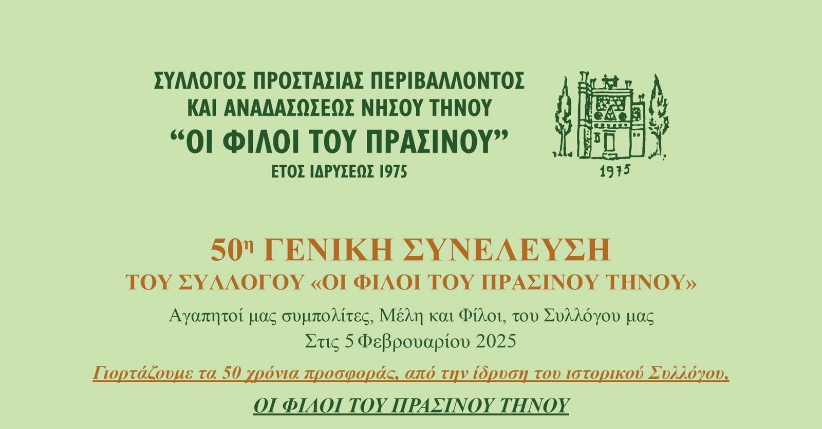 Ο Σύλλογος Προστασίας Περιβάλλοντος και Αναδασώσεων Νήσου Τήνου «Οι Φίλοι του Πρασίνου» γιορτάζει τα 50 χρόνια από την ίδρυσή του (1975-2025) με την 50ή Γενική του Συνέλευση, που θα πραγματοποιηθεί την Τετάρτη 5 Φεβρουαρίου 2025 στις 18:00 στη συνεδριακή αίθουσα του ΙΤΗΠ.