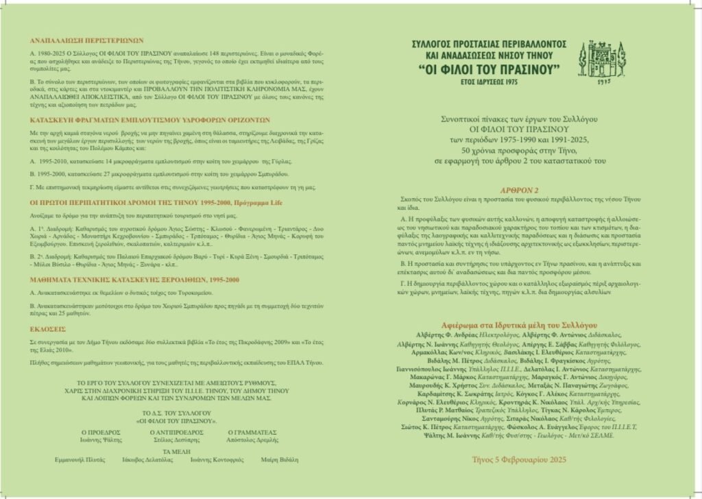 ΓΙΟΡΤΑΖΟΥΜΕ ΤΑ 50 ΧΡΟΝΙΑ ΑΠΟ ΤΗΝ ΙΔΡΥΣΗ ΤΟΥ ΣΥΛΛΟΓΟΥ «ΟΙ ΦΙΛΟΙ ΤΟΥ ΠΡΑΣΙΝΟΥ» ΚΑΙ ΤΙΜΟΥΜΕ ΤΟΥΣ ΦΟΡΕΙΣ & TA ΦΥΣΙΚΑ ΠΡΟΣΩΠΑ ΠΟΥ ΔΙΑΧΡΟΝΙΚΑ ΣΤΗΡΙΞΑΝ ΤΟ ΕΡΓΟ ΤΟΥ