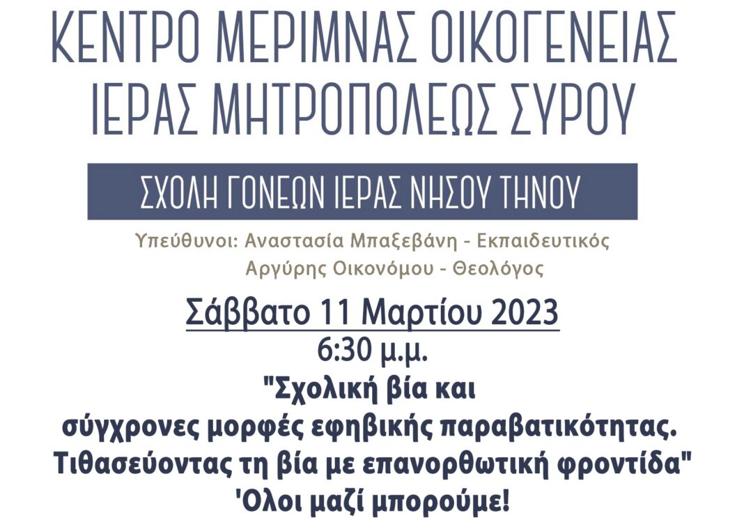 Το Σάββατο 11 Μαρτίου του 2023 στις 18.30 θα πραγματοποιηθεί η συνάντηση για τη “Σχολή Γονέων Ιεράς Νήσου Τήνου” με ομιλήτρια την Αφροδίτη Μαλλούχου (Κοινωνική Λειτουργός).