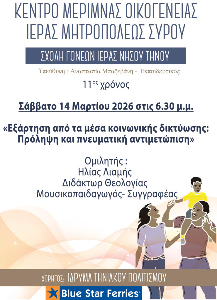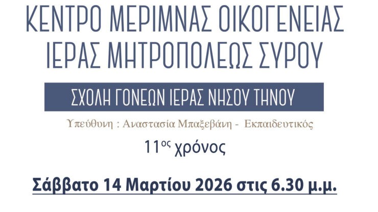 Το Κέντρο Μέριμνας Οικογένειας της Ιεράς Μητροπόλεως Σύρου, στο πλαίσιο ΤΟΥ 11 ου χρόνου της Σχολής Γονέων Ιεράς Νήσου Τήνου, διοργανώνει την 5η συνάντηση το Σάββατο 14 Μαρτίου 2026 στις 18:30, στο Ίδρυμα Τηνιακού Πολιτισμού, με θέμα:
