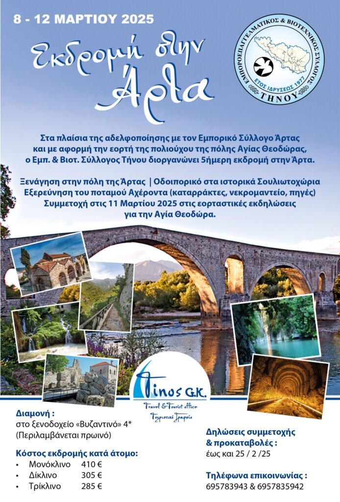 Ο Εμπορικός και Βιοτεχνικός Σύλλογος Τήνου διοργανώνει 5ήμερη εκδρομή στην Άρτα από τις 8 έως τις 12 Μαρτίου 2025, στο πλαίσιο αδελφοποίησης με τον Εμπορικό Σύλλογο Άρτας και με αφορμή την εορτή της πολιούχου Αγίας Θεοδώρας.