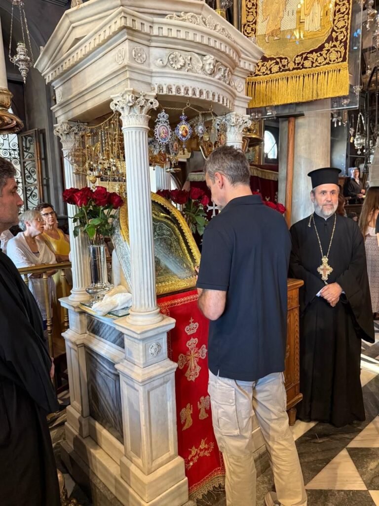 Λίγα λεπτά αργότερα, οι δεκάδες πιστοί που βρίσκονταν στην Παναγία είδαν ανάμεσά τους Νόλε και Μητσοτάκη να περιμένουν να ανάψουν κερί και να προσκυνήσουν τη θαυματουργή εικόνα.