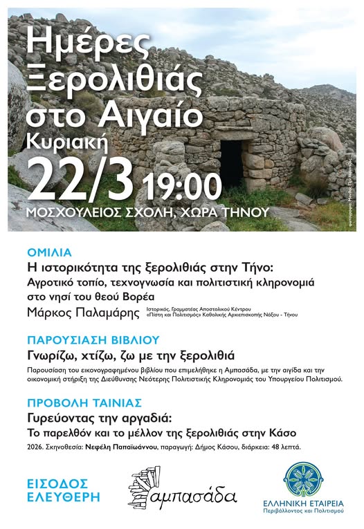 Η Αμπασάδα σας προσκαλεί όλους και ιδιαιτέρως τους γονείς και τους εκπαιδευτικούς όλων των βαθμίδων, στη Μοσχούλα, αυτή την Κυριακή 22 Μαρτίου στις 19.00, στην εκδήλωση με την οποία συμμετέχει στις «Ημέρες Ξερολιθιάς στο Αιγαίο», που διοργανώνει η Ελληνική Εταιρεία Περιβάλλοντος και Πολιτισμού.