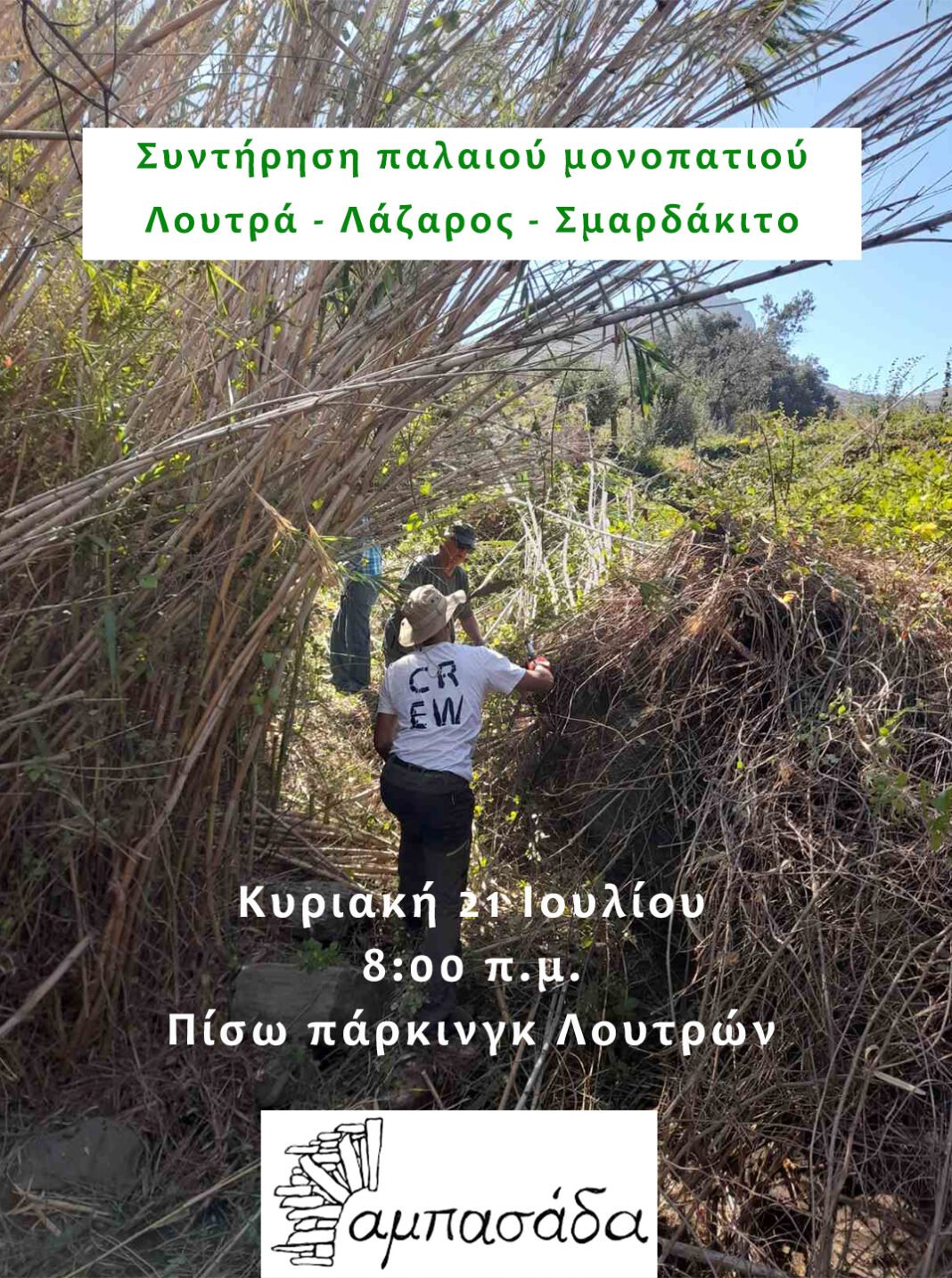 Στόχος μας είναι η αποκατάσταση της παλαιάς αγροτικής οδού και της διασύνδεση του Σμαρδακίτου με τα Λουτρά που έχει χαθεί από πολλές δεκαετίες. Πέρυσι, πραγματοποιήσαμε δύο καθαρισμούς σε 800 μέτρα μονοπατιού από το Σμαρδάκιτο χωρίς να καταφέρουμε να φτάσουμε στα Λουτρά, λόγω του κατακριμνησμένου σημείου από τις πλημμύρες του 1976.