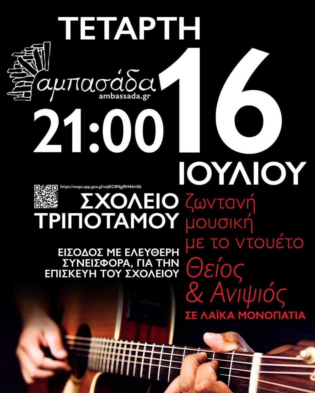 Ο Σύλλογος «Αμπασάδα» σας προσκαλεί την Τετάρτη 16 Ιουλίου στις 21:00 στην αυλή του Σχολείου Τριποτάμου