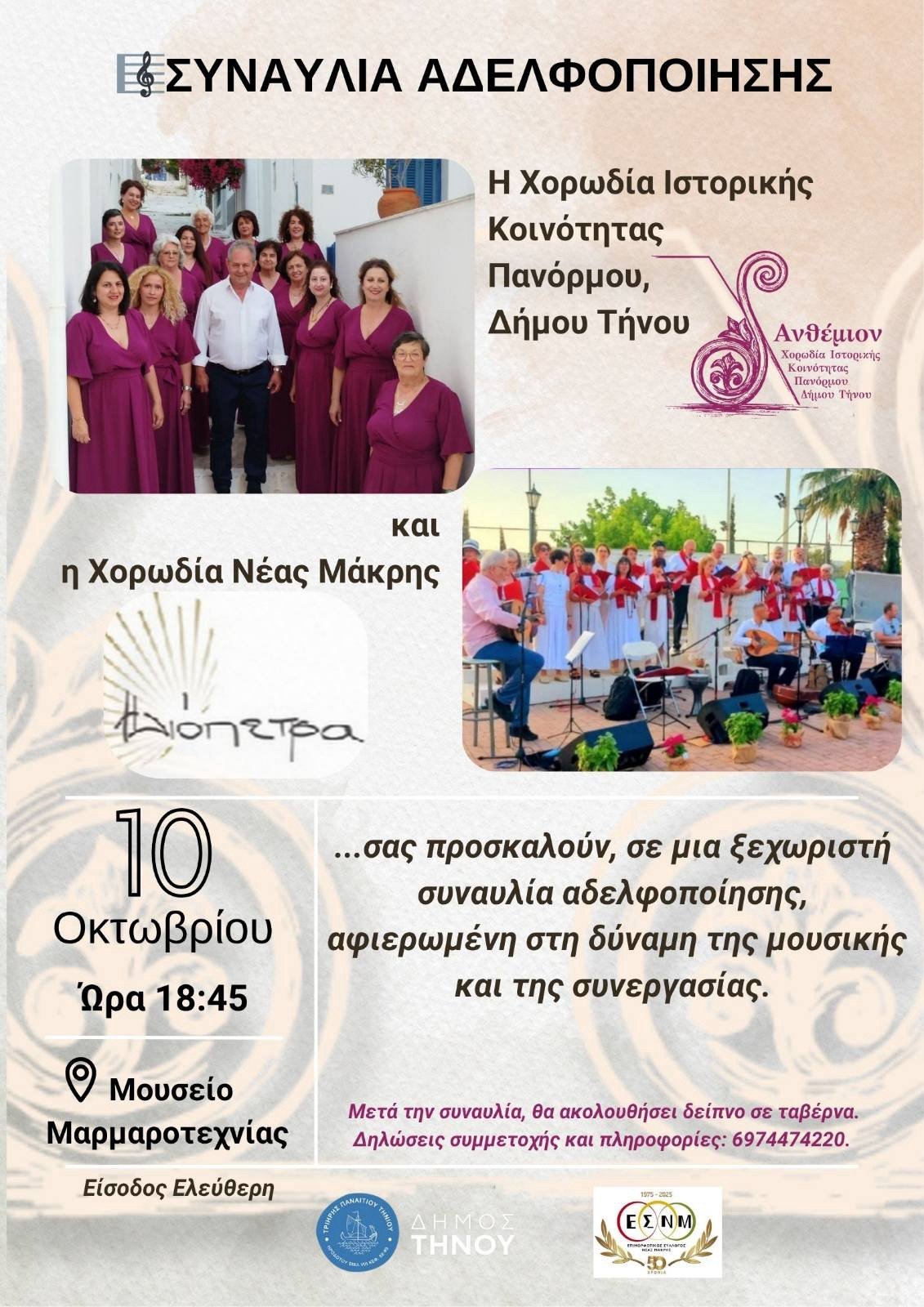 Η Χορωδία «Ανθέμιον» της Ιστορικής Κοινότητας Πανόρμου Δήμου Τήνου και η μαέστρος της, Μαργαρίτα Σαλταμανίκα, σας προσκαλούν την Παρασκευή  10 Οκτωβρίου στις 18.45, στο Μουσείο Μαρμαροτεχνιας στον Πύργο Τήνου, στην εκδήλωση αδελφοποίησής με τη Χορωδία «Ηλιόπετρα» του Επιμορφωτικού Συλλόγου Νέας Μάκρης, υπό τη μουσική καθοδήγηση του Χρήστου Τσιαμούλη.