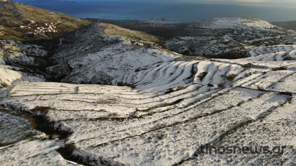 Εντυπωσιακές αεροφωτογραφίες τραβηγμένες από drone τα χιονισμένα ορεινά της Τήνου.