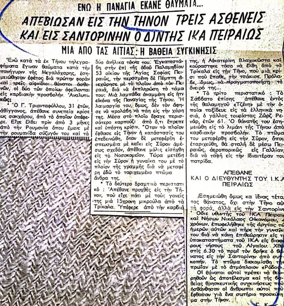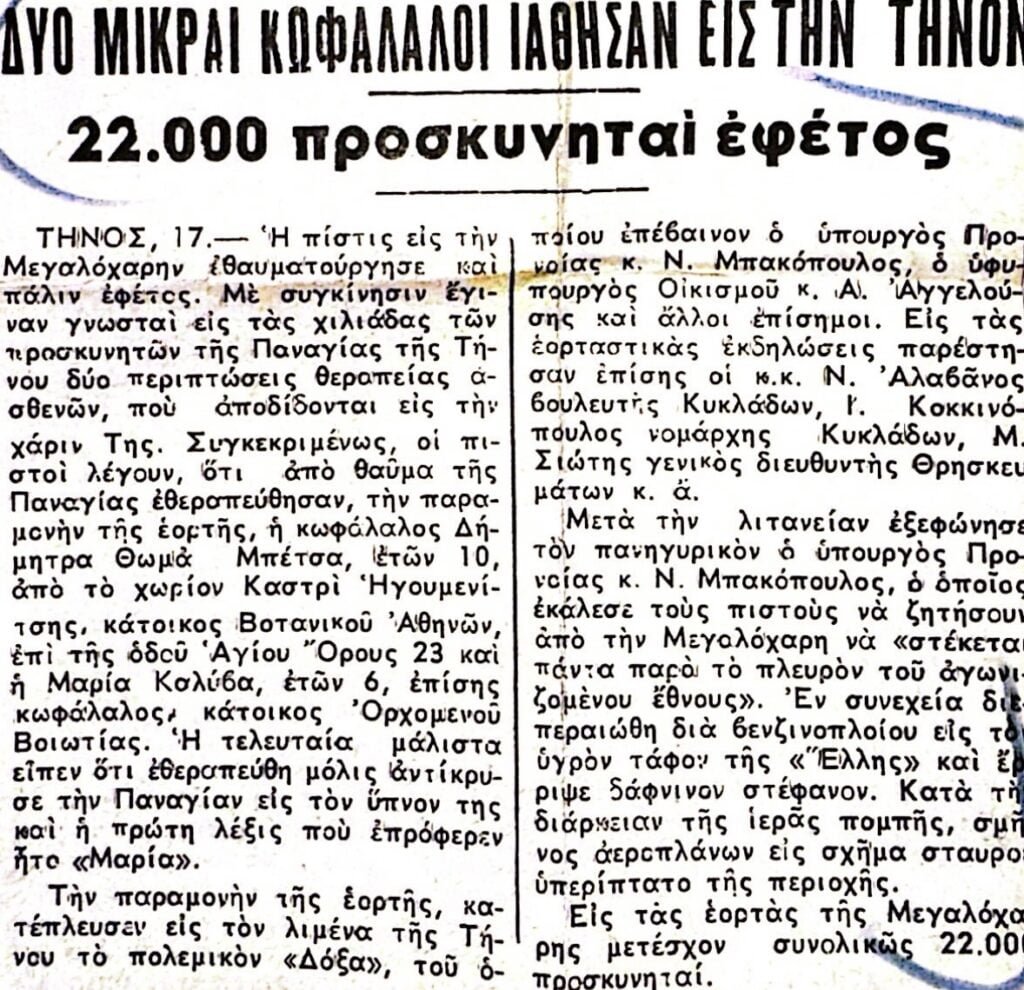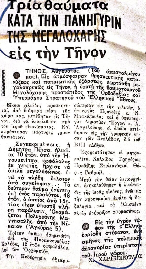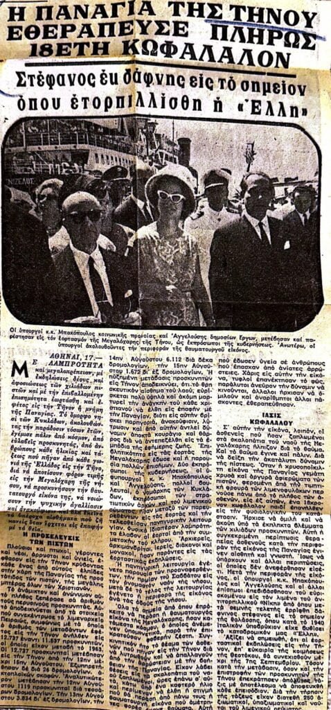 Διαβάστε τα αφιερώματα της εποχής (1964) για το Ιερό Ίδρυμα Ευαγγελιστρίας Τήνου καθώς και αναφορές σε αρρώστους και θαύματα.