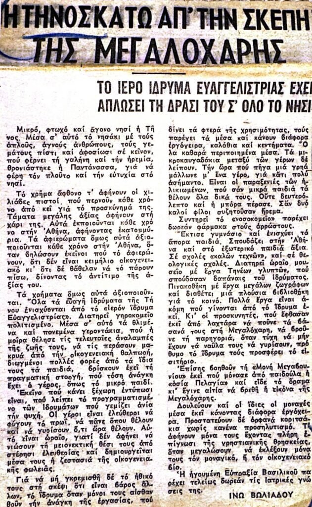 Αφιέρωμα του 1964 για τη δράση του Πανελλήνιου Ιερού Ιδρύματος Ευαγγελιστρίας Τήνου