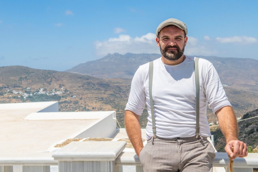 Είναι ευρυμαθής, εύγλωττος και λαλίστατος. Προσηνής και τόσο φιλικός που καταφέρνει να με κάνει να τον συμπαθήσω από τα πρώτα λεπτά της συνάντησής μας, όπου θα φθάσει κρατώντας ένα μπουκάλι από την σπιτική ρακή του για να μου κάνει δώρο. Είναι ντυμένος casual αλλά στις λαογραφικές περιηγήσεις που κάνει έχει επιλέξει να ντύνεται όπως οι παλιοί Τήνιοι -και με έναν μαγικό τρόπο να μην δείχνει γραφικός.
