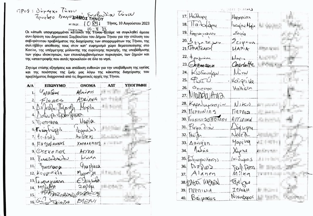 40 πολίτες ζητούν εξηγήσεις και απόδοση ευθυνών για την υποβάθμιση της υγείας και της ποιότητας της ζωής τους, λόγω της κάκιστης διαχείρισης του προβλήματος διαχρονικά από τις δημοτικές αρχές της Τήνου.