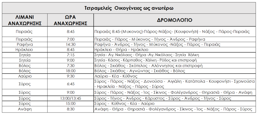 20% έκπτωση στα εισιτήρια επιβάτη σε όλα τα νησιά του Αιγαίου στα δρομολόγια όπως αναφέρονται στον παρακάτω πίνακα. (Για τους μόνιμους κατοίκους Δωδεκανήσων έκπτωση 40% στη γραμμή Σητεία – Δωδεκάνησα).
