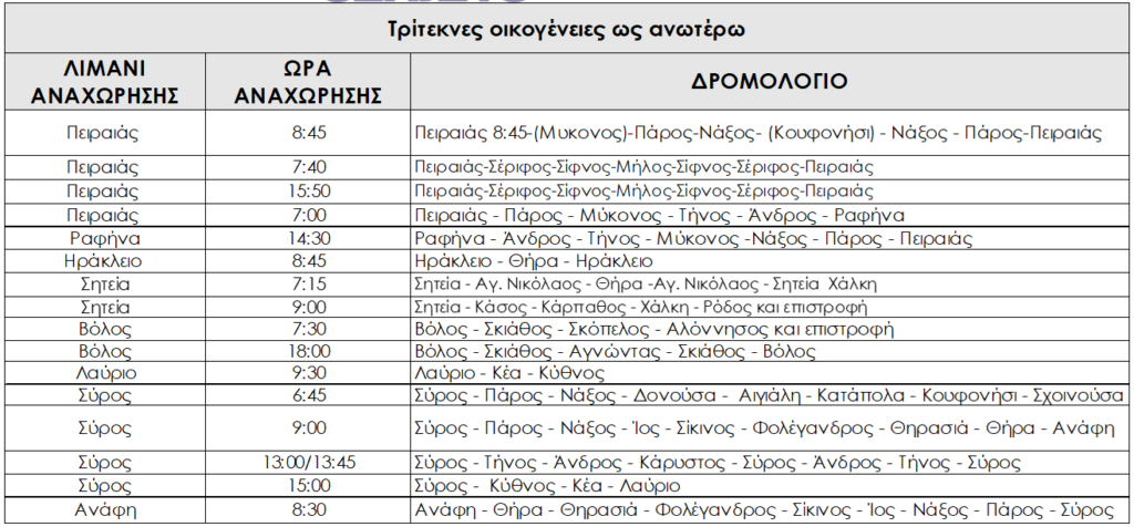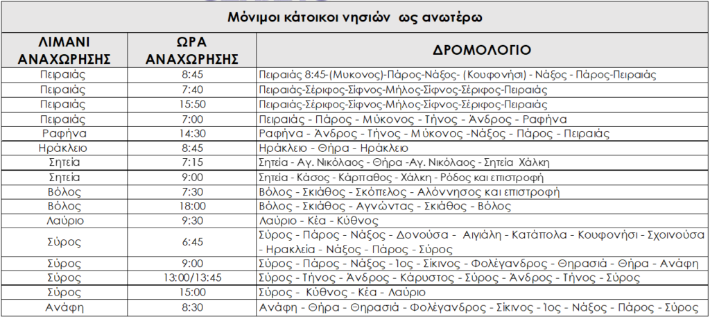 20% έκπτωση στα εισιτήρια επιβάτη σε όλα τα νησιά του Αιγαίου στα δρομολόγια όπως αναφέρονται στον παρακάτω πίνακα. (Για τους μόνιμους κατοίκους Δωδεκανήσων έκπτωση 40% στη γραμμή Σητεία – Δωδεκάνησα).