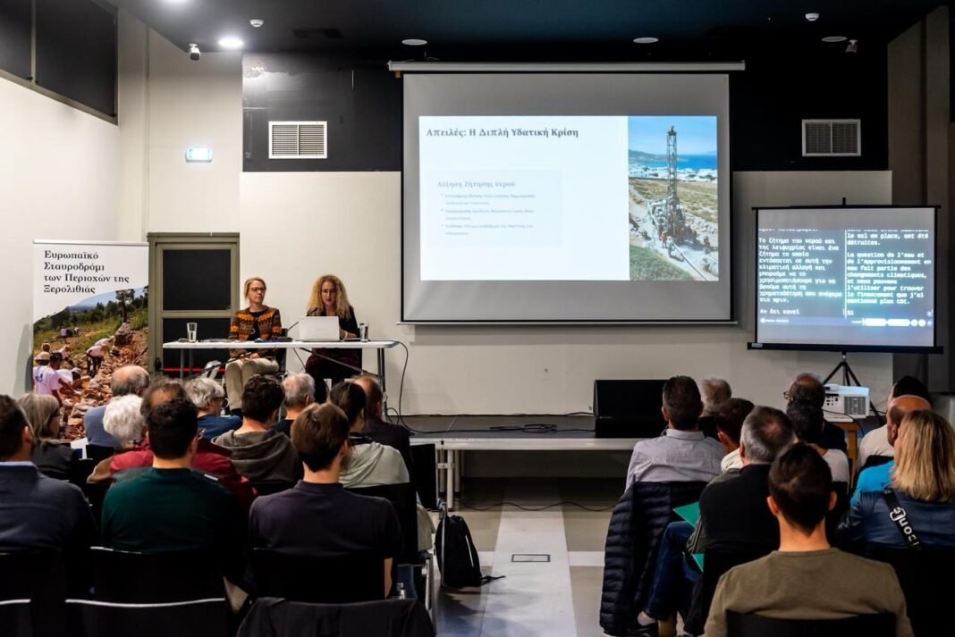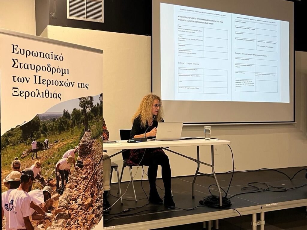 Η Αναστασία Ψάλτη, πρόεδρος της ΚΟΙΝΣΕΠ «Το Μπατίκι», αφού εξήγησε -κατά την ομιλία της- ότι η ΚΟΙΝΣΕΠ έχει στόχο την άντληση καλών ευρωπαϊκών πρακτικών για «να πετύχουμε πράγματα για το νησί μας», ανέδειξε την κρίσιμη σημασία των ξερολιθιών για το μέλλον της Τήνου. Όπως υπογράμμισε, «η υπαρξιακή απειλή που φαίνεται να αντιμετωπίζει το νησί μας είναι διπλή και συνεχώς αυξάνεται: λειψυδρία και προοδευτική ερημοποίηση των εδαφών». Εξήγησε, σε ό,τι αφορά το πρώτο, πως «η μεγάλη αύξηση της ζήτησης του νερού, λόγω του τουρισμού που διαρκώς αυξάνεται, λόγω της κλιματικής αλλαγής και της μείωσης των βροχοπτώσεων, λόγω της μη ορθής διαχείρισης του θέματος των υδρογεωτρήσεων, δεν αντιμετωπίζεται με επάρκεια». Σε ό,τι αφορά τη δεύτερη πρόκληση, είπε ότι οι ξερολιθιές, που σήμερα έχουν καταστραφεί, λειτουργούσαν τα προηγούμενα πολλά χρόνια ως σύστημα συγκράτησης εδαφών και φυσικής διαχείρισης υδατικών πόρων. «Οι ξερολιθιές δεν είναι απλώς τοίχοι. Είναι σύστημα ήπιας διοχέτευσης του νερού στο έδαφος, χωρίς να παρασύρεται το έδαφος. Το νερό κυλά ήπια και αργά, εμποτίζει το χώμα, εμπλουτίζει τους υδροφόρους ορίζοντες», σημείωσε.