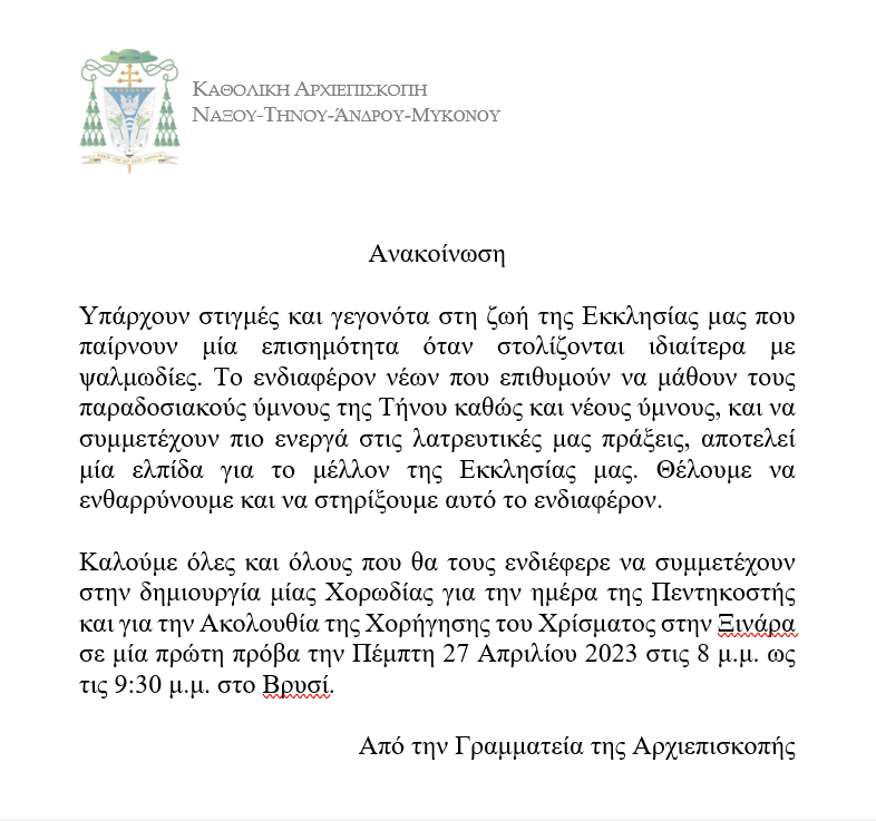 Καλούμε όλες και όλους που θα τους ενδιέφερε να συμμετέχουν στην δημιουργία μίας Χορωδίας για την ημέρα της Πεντηκοστής και για την Ακολουθία της Χορήγησης του Χρίσματος στην Ξινάρα σε μια πρώτη πρόβα την Πέμπτη 27 Απριλίου 2023 στις 8 μ.μ. έως τις 9:30 μ.μ. στο Βρύσι.