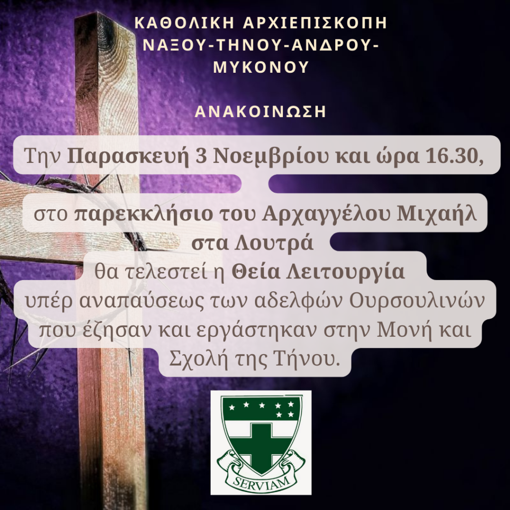 Ανακοίνωση τέλεσης Θείας Λειτουργίας υπέρ Αναπαύσεως των Αδελφών Ουρσουλινών