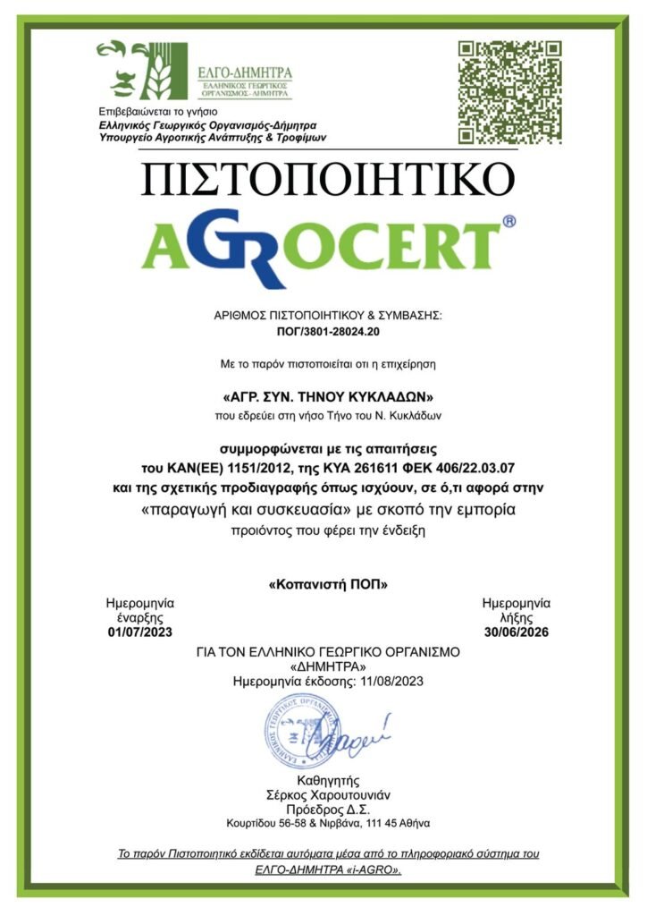Με ιδιαίτερη ικανοποίηση και χαρά ανακοινώνουμε οτι μετά από ενδελεχή έλεγχο του AGROCERT του Υπουργείου Αγροτικής Ανάπτυξης ανανεώθηκε η πιστοποίηση του τυροκομείου μας όσο αφορά την παραγωγή της ΚΟΠΑΝΙΣΤΗΣ μας ως προιόντος Προστατευόμενης Ονομασίας Προέλευσης , ως ΠΟΠ δηλαδή…