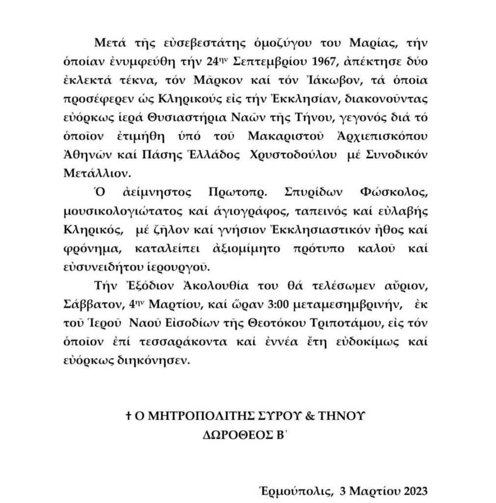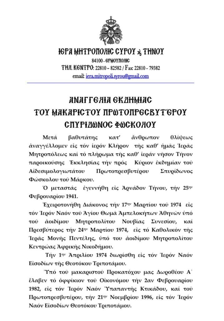 Ιερά Μητρόπολη Σύρου-Τήνου: Αναγγελία Εκδημίας του Μακαριστού Πρωτοπρεσβυτέρου Σπυρίδωνος Φωσκόλου