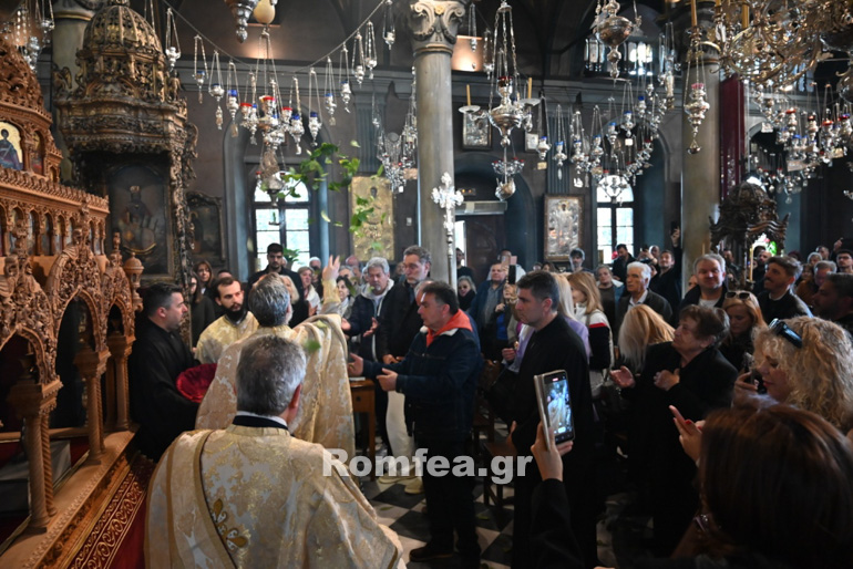 Κατά τη διάρκεια της Θείας Λειτουργίας, οι εκκλησιασθέντες, με το «Ανάστα ο Θεός, κρίνον την γην» μετ’ ευλαβείας αλλά και χαράς, παρέλαβον τα λεμονόφυλλα τα οποία εκ του Ιερού Βήματος διενεμήθησαν κατά το εκκλησιαστικό έθος.