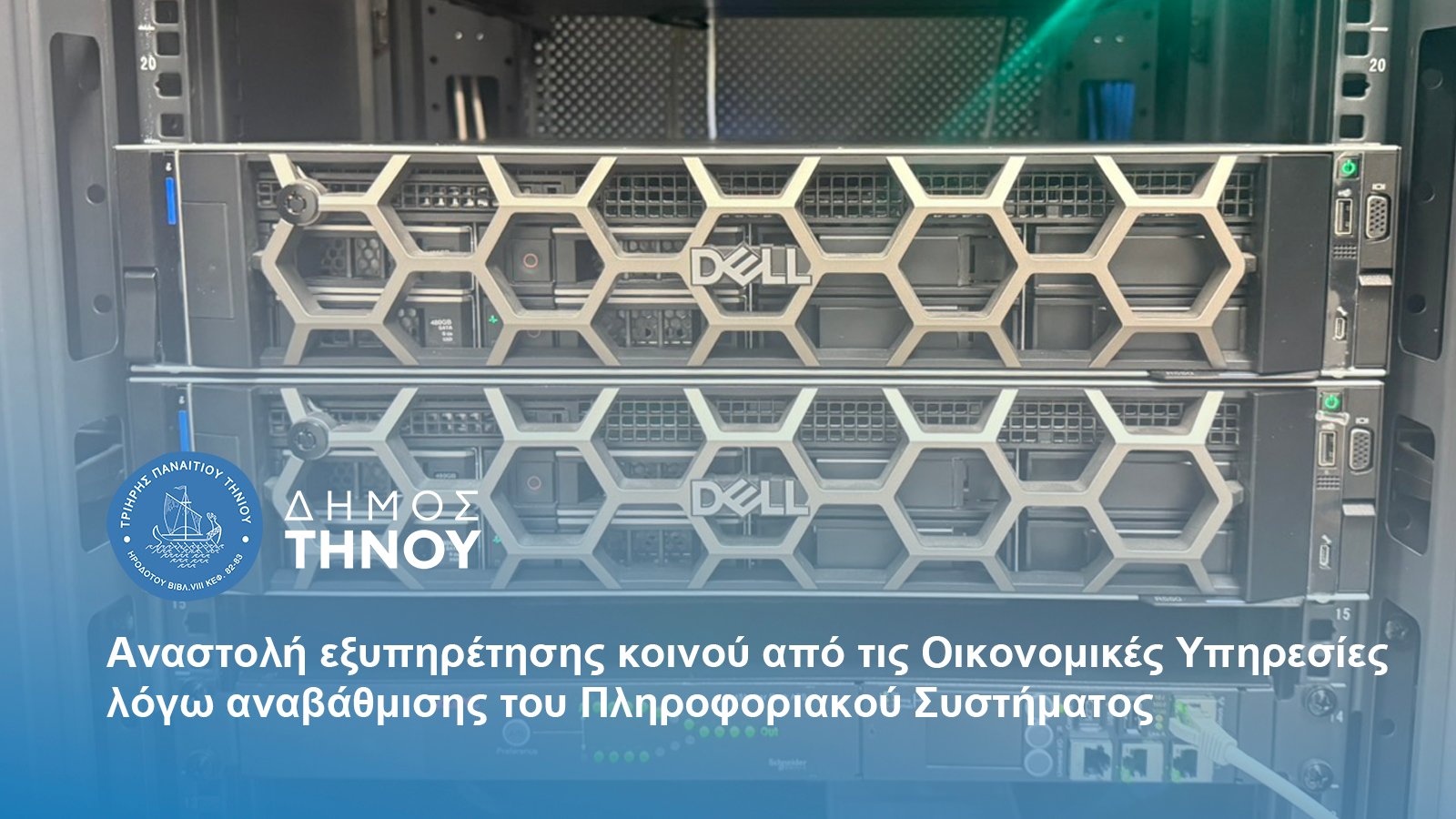 Ο Δήμος Τήνου ενημερώνει ότι από Πέμπτη 13 Νοεμβρίου 2025, στις 12:00, έως και Δευτέρα 24 Νοεμβρίου 2025, στις 15:00, οι Οικονομικές Υπηρεσίεςδεν θα εξυπηρετούν το κοινό, λόγω αναβάθμισης του Πληροφοριακού Συστήματος στο Δήμο μας.