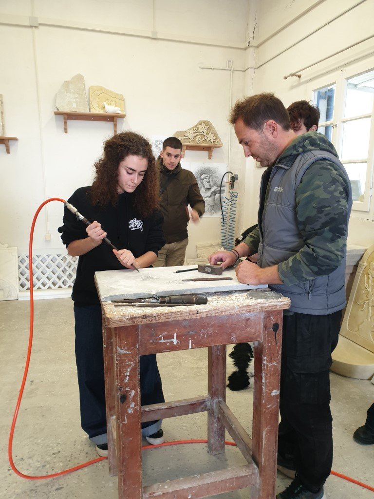 Υπεύθυνοι υλοποίησης εργαστηριακών μαθημάτων του 1ου Εργαστηριακού Κέντρου Β΄ Αθήνας- Αγίας Παρασκευής: Γιώργος Μποχτανίδης (συντονιστής εκπαιδευτικός), Χαρίκλεια Τσιώνη (συμμετέχουσα εκπαιδευτικός) και Ρωσάννα Τίκα (μαρμαρογλύπτρια).