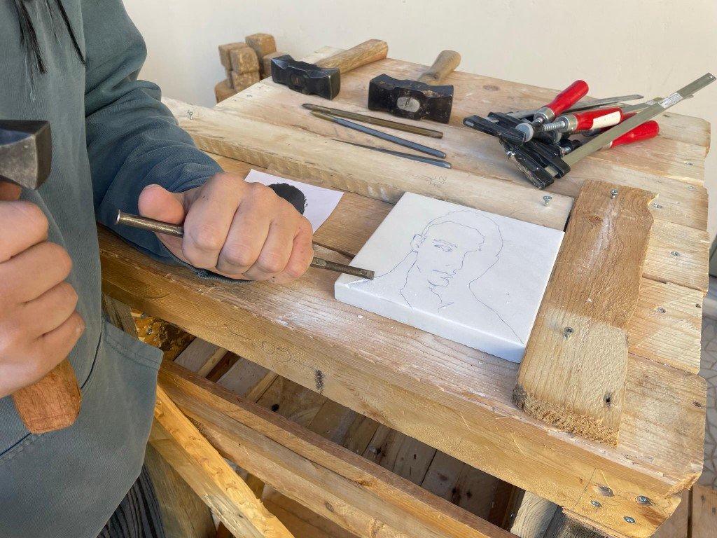 Η πρώτη περίοδος (Ιανουάριος – Απρίλιος 2023) αφορούσε την υλοποίηση εργαστήριων εκμάθησης της τέχνης του μαρμάρου από επαγγελματίες μαρμαρογλύπτες (αποφοίτους του Προπαρασκευαστικού Επαγγελματικού Σχολείου Καλών Τεχνών Πανόρμου Τήνου -ΠΕΣΚΠΤ-) σε μαθητές λυκείου, αλλά, και σε ενήλικες με αγάπη για την τέχνη του νησιού. Στην Τήνο, δεκατέσσερις εκπαιδευόμενοι (μαθητές και ενήλικες) είχαν την ευκαιρία να «μαθητεύσουν» στα εργαστήρια μαρμαρογλυπτικής των Λορέντζου Βιδάλη, Νικολάου Δεσύπρη, Ονούφριου Δεσύπρη και αδελφών Κουσουνάδη και μέσα από μια σειρά έξι τετράωρων εργαστηριακών μαθημάτων να παράξουν τα δικά τους έργα μαρμαρογλυπτικής με τη φροντίδα και την καθοδήγηση των «δασκάλων» τους. Στην Αθήνα, δεκατέσσερις μαθητές του 2ου ΕΠΑΛ Αγίας Παρασκευής διδάχθηκαν την τέχνη του μαρμάρου από την κυρία Ρωσάννα Τίκα, απόφοιτο της ΠΕΣΚΤΠΤ, στα εργαστήρια του 1ου Εργαστηριακού Κέντρου Β΄Αθήνας – Αγίας Παρασκευής, σε μια σειρά είκοσι δίωρων εργαστηριακών μαθημάτων με την παρουσία και φροντίδα και των υπευθύνων καθηγητών, Χαρίκλειας Τσιώνη και Γεώργιου Μποχτανίδη.