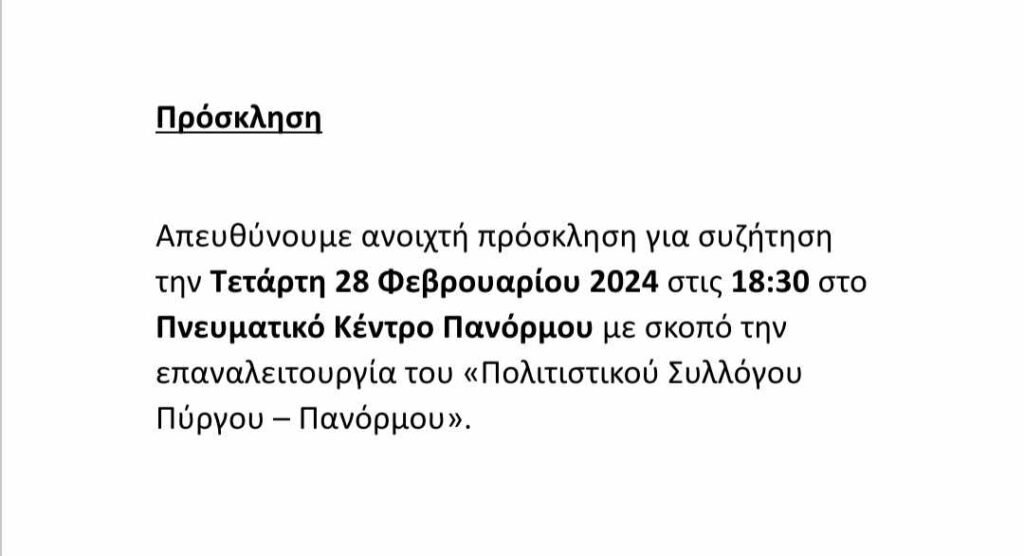 Απευθύνουμε ανοιχτή πρόσκληση για συζήτηση την Τετάρτη 28 Φεβρουαρίου 2024 στις 18:30 στο Πνευματικό Κέντρο Πανόρμου με σκοπό την επαναλειτουργία του “Πολιτιστικού Συλλόγου Πύργου – Πανόρμου”