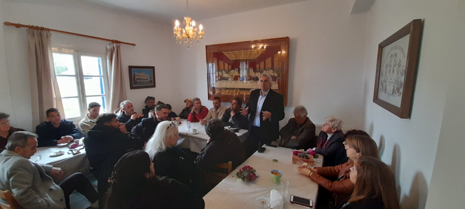 Στη συνάντηση παρευρέθηκε ο Δήμαρχος Τήνου, κ. Παναγιώτης Κροντηράς, συνοδευόμενος από αντιδημάρχους, εντεταλμένους συμβούλους και στελέχη της Δημοτικής Αρχής, στο πλαίσιο των προγραμματισμένων επισκέψεων στις Δημοτικές Κοινότητες του νησιού.