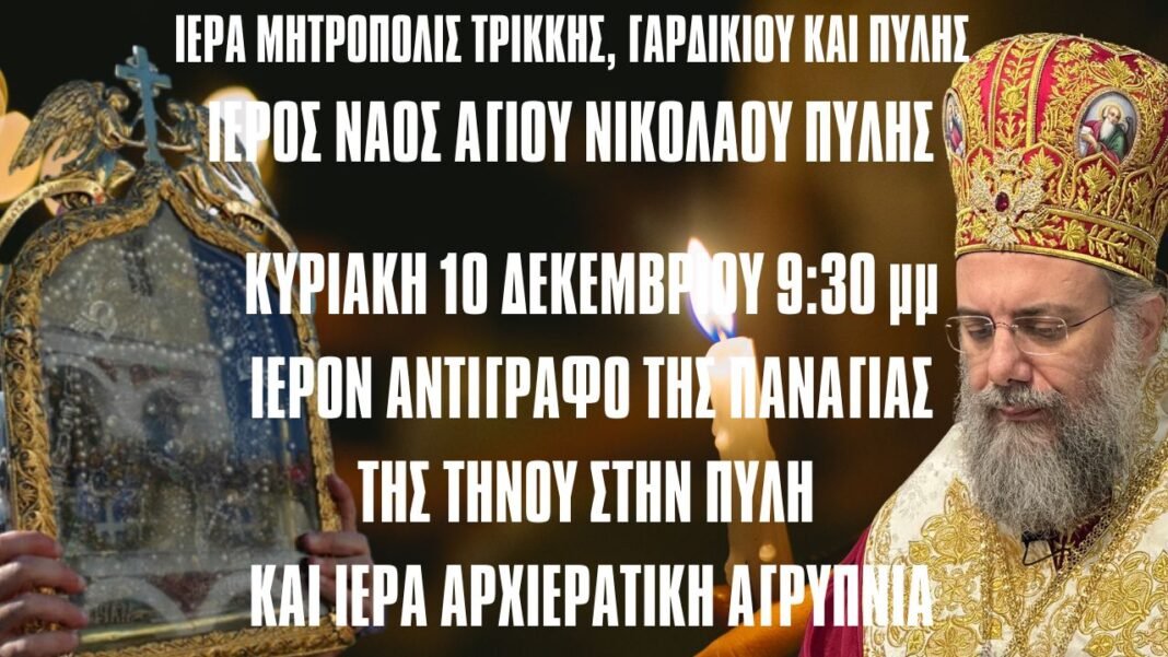 Αύριο, Κυριακή βράδυ ώρα 9.30 ο Σεβασμιώτατος Μητροπολίτης Τρικκης Γαρδικιου και Πύλης θα κομισει ως ευλογία στον Ιερό Ναό του Αγίου Νικολάου Πύλης Ιερόν Αντίγραφο της εικόνας της Μεγαλόχαρης της Τήνου και ακολούθως θα τελέσει Ιερά Αγρυπνία.
