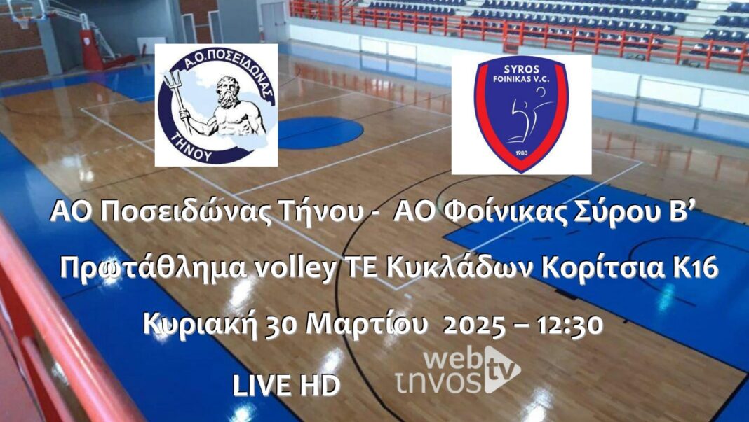 Παρακολουθήστε την Κυριακή 30 Μαρτίου 2025 στις 12:30 τον αγώνα μεταξύ των ομάδων ΑΟ Ποσειδώνας Τήνου – ΑΟ Φοίνικας Σύρου Β’ για το Πρωτάθλημα volley TE Κυκλάδων Κορίτσια Κ16