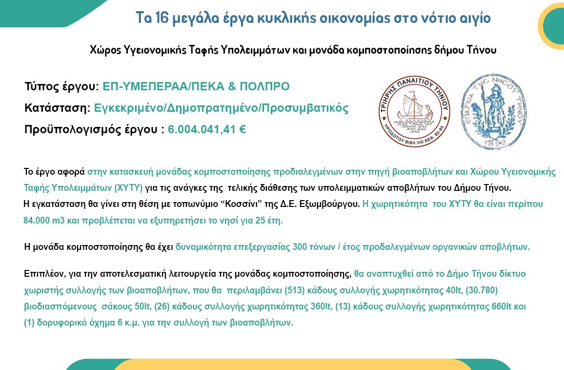 Το έργο αφορά στην κατασκευή μονάδας κομποστοποίησης προδιαλεγμένων στην πηγή βιοαποβλήτων και Χώρου Υγειονομικής Ταφής Υπολειμμάτων (ΧΥΤΥ) για τις ανάγκες της τελικής διάθεσης των υπολειμματικών αποβλήτων του Δήμου Τήνου. Η εγκατάσταση θα γίνει στη θέση με τοπωνύμιο “Κοσσίνι” της Δ.Ε. Εξωμβούργου. Η χωρητικότητα του ΧΥΤΥ θα είναι περίπου 84.000 m3 και προβλέπεται να εξυπηρετήσει το νησί για 25 έτη.