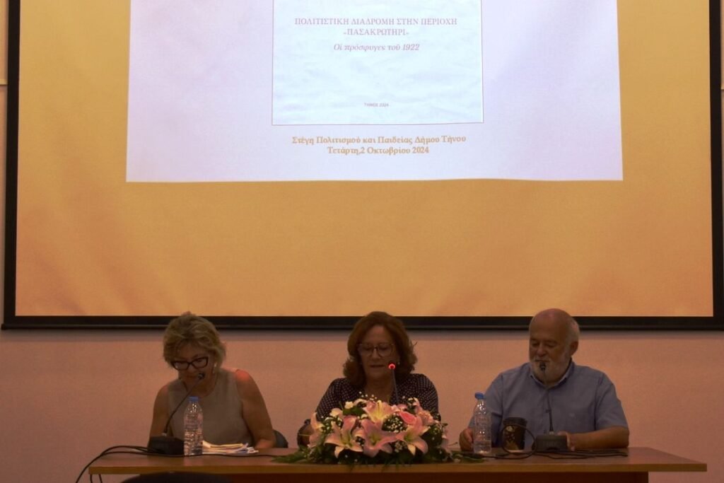 Την Τετάρτη 2 Οκτωβρίου 2024 πραγματοποιήθηκε στη Στέγη Πολιτισμού & Παιδείας του Δήμου Τήνου, (Μοσχούλα) η παρουσίαση του βιβλίου της συνταξιούχου εκπαιδευτικού κ. Πηνελόπης Διασκούφη με τίτλο: {ΠΟΛΙΤΙΣΤΙΚΗ ΔΙΑΔΡΟΜΗ ΣΤΗΝ ΠΕΡΙΟΧΗ «ΠΑΣΑΚΡΩΤΗΡΙ» – Οι πρόσφυγες του 1922}.