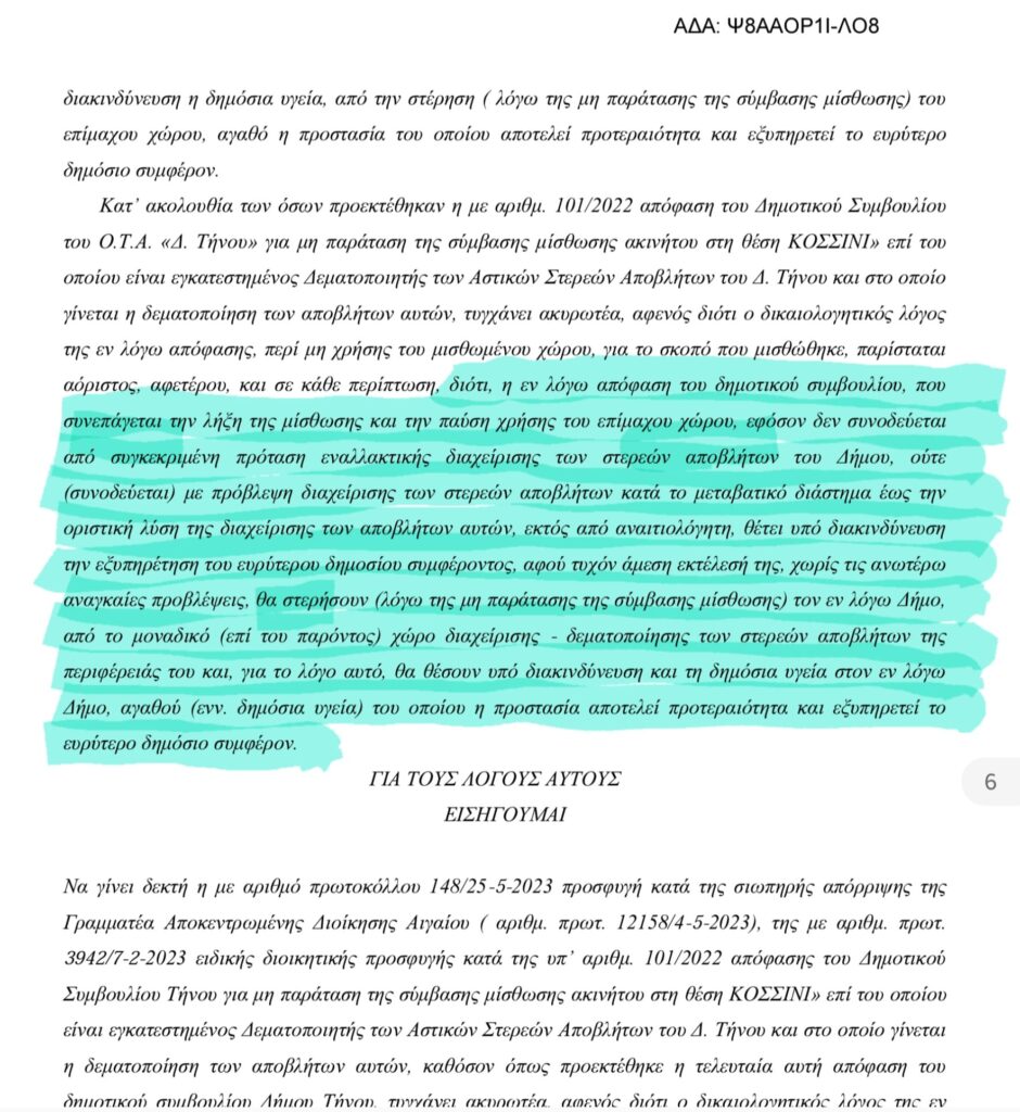 ψήφισαν παράνομα και κατά κατάχρηση της εξουσίας τους, τη λήξη της μίσθωσης και το «κλείσιμο» του χώρου δεματοποίησης στο Κοσσίνι, δημιουργώντας νέα προβλήματα και καταδικάζοντας τον Δήμο Τήνου να αναζητά εναλλακτικές νομικές, οικονομικές και πρακτικές λύσεις στον πολύπαθο – όπως σε όλους τους τόπους- κλάδο της διαχείρισης των απορριμμάτων.