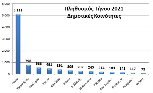 Η μεγάλη μερίδα του πληθυσμού ζει στη Δημοτική Κοινότητα Τήνου, (5.111 άτομα) με τεράστια απόκλιση από τη 2η, τη Δημοτική Κοινότητα Τριαντάρου που εμφανίζει 798 άτομα πληθυσμό και επόμενη ακολουθεί η Κοινότητα Πανόρμου με 566 άτομα. Από τις 13 Κοινότητες του νησιού, οι 7 εμφανίζουν μείωση πληθυσμού σε σχέση με το 2011 και οι υπόλοιπες 6 αύξηση. Αναλυτικότερα στον πίνακα που ακολουθεί: