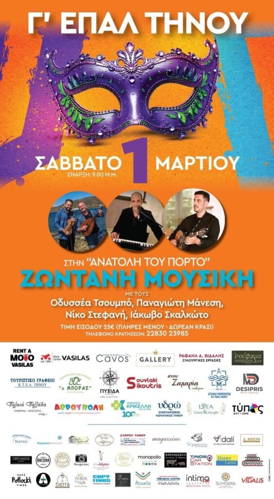 Το Γ’ ΕΠΑΛ Τήνου διοργανώνει αποκριάτικη εκδήλωση το Σάββατο 1 Μαρτίου στις 21:00, στο κέντρο «Ανατολή του Πόρτο». Η βραδιά θα περιλαμβάνει ζωντανή μουσική με τους Οδυσσέα Τσουμπό, Παναγιώτη Μάνεση, Νίκο Στεφανή και Ιάκωβο Σκαλκώτο.