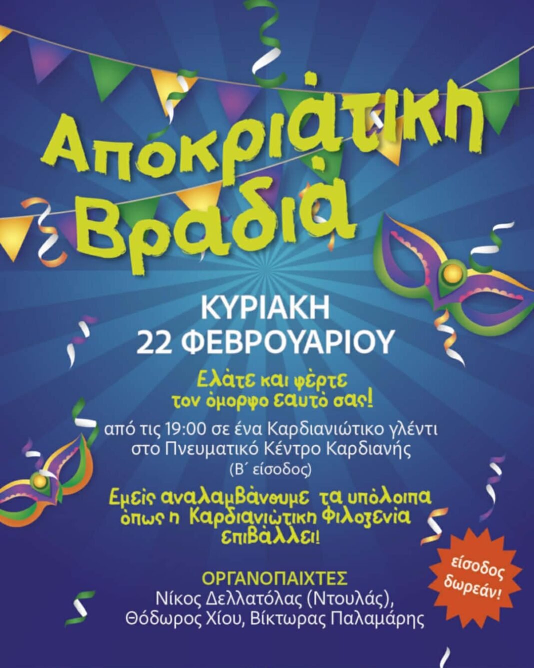 Αποκριάτικο γλέντι διοργανώνεται την Κυριακή 22 Φεβρουαρίου στο Πνευματικό Κέντρο Καρδιανής, με ένα παραδοσιακό καρδιανιώτικο βράδυ γεμάτο μουσική, κέφι και φιλοξενία.