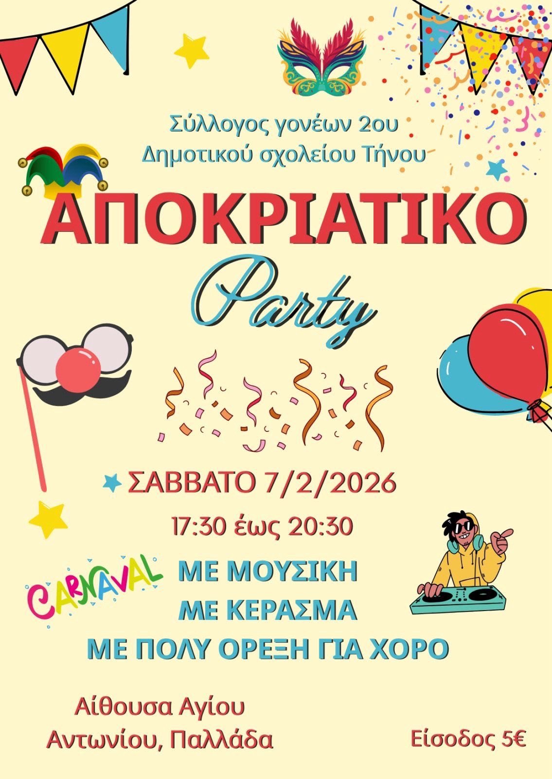 Αποκριάτικο Πάρτι διοργανώνει ο Σύλλογος Γονέων του 2ου Δημοτικού Σχολείου Τήνου το Σάββατο 7 Φεβρουαρίου 2026, στην Αίθουσα Αγίου Αντωνίου στην Παλλάδα, από τις 17:30 έως τις 20:30.