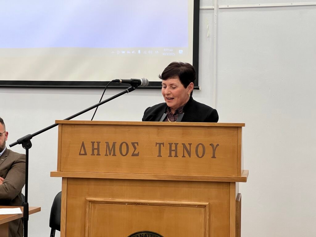 Η εκδήλωση ξεκίνησε με χαιρετισμό του Δημάρχου Τήνου κ. Παναγιώτη Κροντηρά και ανάγνωση χαιρετισμού που απέστειλε η Έπαρχος Τήνου κ. Αναστασία Δεληγιάννη.