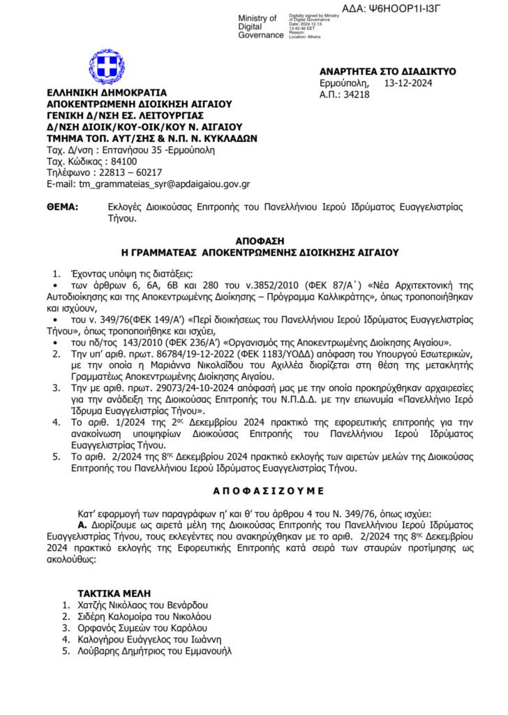 Α. Διορίζουμε ως αιρετά μέλη της Διοικούσας Επιτροπής του Πανελληνίου Ιερού Ιδρύματος Ευαγγελιστρίας Τήνου, τους εκλεγέντες που ανακηρύχθηκαν με το αριθ. 2/2024 της 8ης Δεκεμβρίου 2024 πρακτικό εκλογής της Εφορευτικής Επιτροπής κατά σειρά των σταυρών προτίμησης ως ακολούθως: