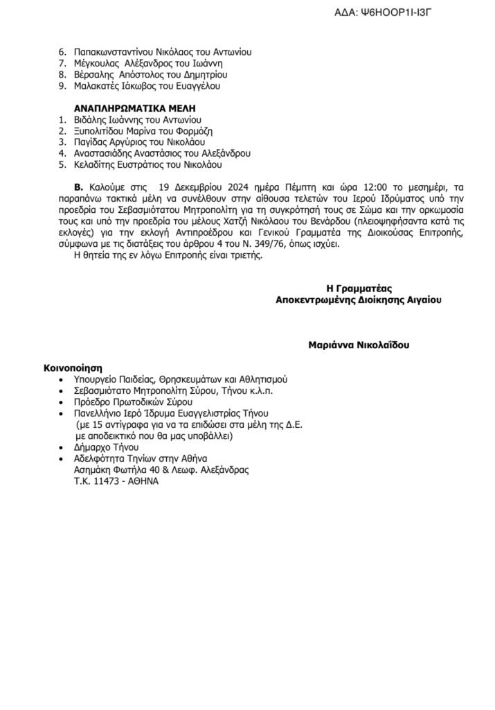 Β. Καλούμε στις 19 Δεκεμβρίου 2024 ημέρα Πέμπτη και ώρα 12:00 το μεσημέρι, τα παραπάνω τακτικά μέλη να συνεδριάσουν στην αίθουσα τελετών του Ιερού Ιδρύματος υπό την προεδρία του Σεβασμιωτάτου Μητροπολίτη για τη συγκρότησή τους σε Σώμα και την ορκωμοσία τους και υπό την προεδρία του μέλους Χατζή Νικόλαου του Βενάρδου (πλειοψηφήσαντα κατά τις εκλογές) για την εκλογή Αντιπροέδρου και Γενικού Γραμματέα της Διοικούσας Επιτροπής, σύμφωνα με τις διατάξεις του άρθρου 4 του Ν. 349/76, όπως ισχύει.