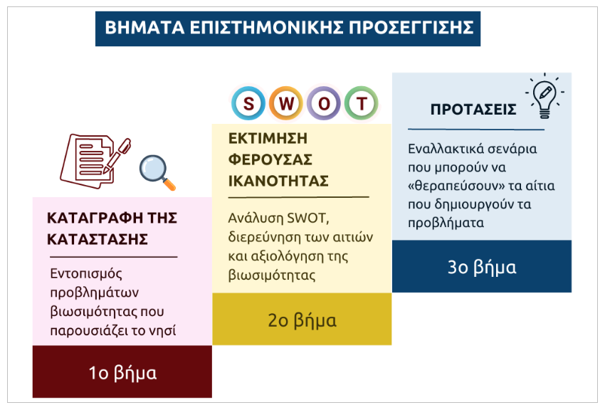 Με βάση τα εργαλεία αυτά το Παρατηρητήριο Βιώσιμου Τουρισμού Αιγαίου* (https://tourismobservatory-n.ba.aegean.gr/) έχει αναπτύξει μεθοδολογία αξιολόγησης της κατάστασης με βάση τις προοπτικές της βιώσιμης ανάπτυξης υπό την αυξανόμενη τουριστική πίεση, μέσα από μια ολοκληρωμένη προσέγγιση σχεδιασμού, η οποία συνοψίζεται σχηματικά παρακάτω: