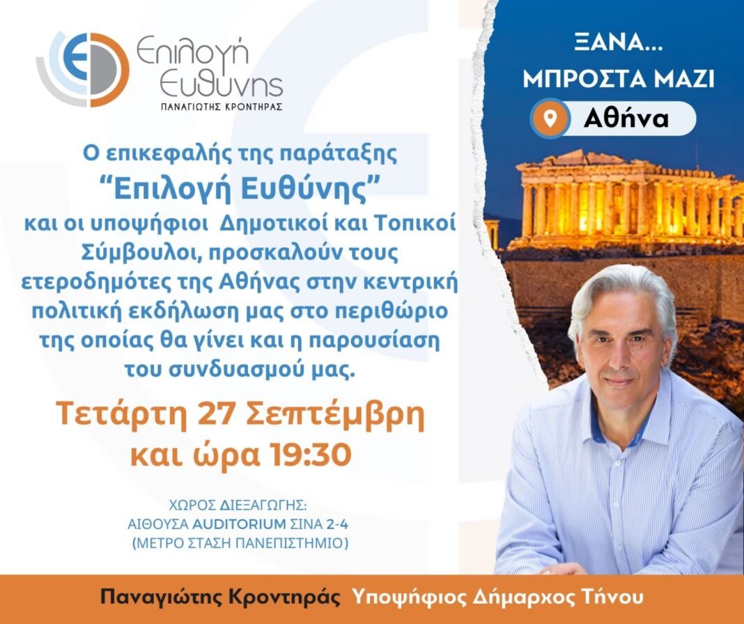 Σήμερα Τετάρτη 27 Σεπτεμβρίου, η ομιλία και η παρουσίαση του συνδυασμού “Επιλογή Ευθύνης” στους ετεροδημότες της Αθήνας