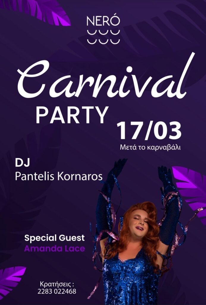 Καθώς οι πομπές και οι παρελάσεις του καρναβαλιού φθάνουν στο τέλος του, το Νερό παρουσιάζει ένα εκρηκτικό Carnival πάρτι στις νότες του καρναβαλιού, όπου ο DJ Pantelis Kornaros θα αναλάβει τα ηνία της μουσικής να σας κρατήσουν χορευτικά σε έναν ακαταμάχητο ρυθμό.